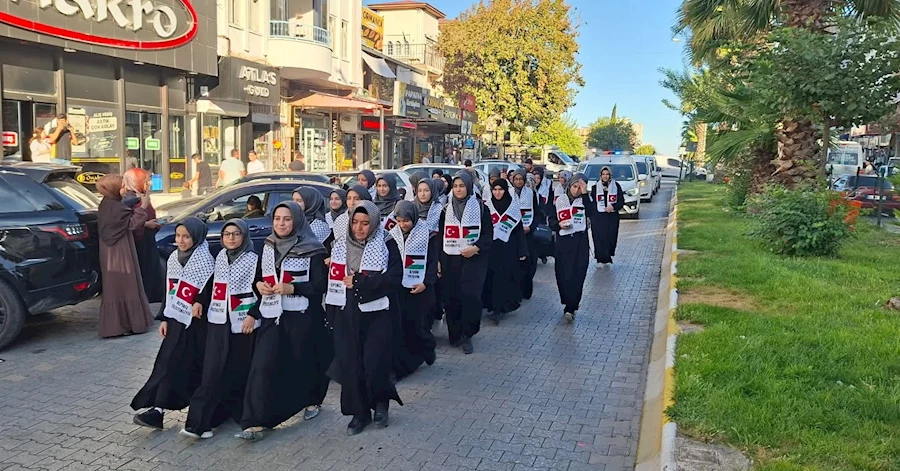 Ellerinde Filistin Bayrakları ve üzerinde “Gökyüzü Yıldızlar, Yeryüzünü Hafızlar Süsler” pankart taşıyan genç hafızlar, hocaları ve hafızlık öğrencileriyle birlikte ilahiler eşliğinde Kaymakamlık önünden AKEDAŞ Kavşağına kadar yürüdü.
