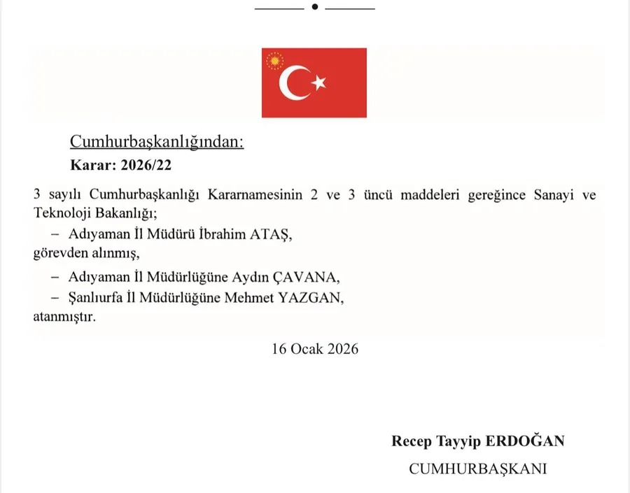 Adıyaman Sanayi ve Teknoloji İl Müdürlüğü’nde görev değişimi yaşandı. Cumhurbaşkanlığı tarafından yayımlanan 16 Ocak 2026 tarihli ve 2026/22 sayılı Resmî Gazete kararı ile İl Müdürü İbrahim Ataş görevden alındı. Ataş’ın yerine Şanlıurfa Sanayi ve Teknoloji İl Müdürü Aydın Çavana atandı.