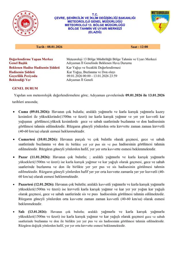 Yapılan açıklamada, olumsuz hava koşullarının ulaşımda aksamalara yol açabileceği, yer yer tipi şeklinde yağışların etkili olabileceği ifade edildi. Özellikle sürücülerin dikkatli olması, zorunlu olmadıkça gece ve sabah erken saatlerde yola çıkılmaması, zincir ve kış lastiği gibi tedbirlerin alınması istendi.
