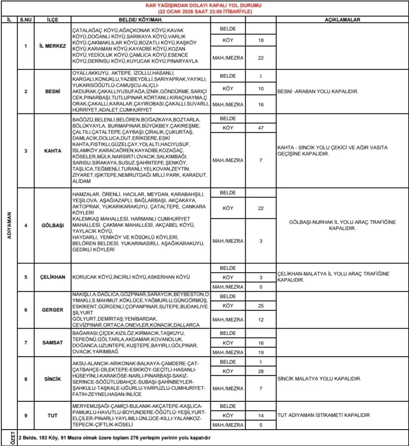 Karayolları ekiplerinin aldığı tedbirler kapsamında, il genelindeki devlet yollarının tır ve çekici trafiğine kapatıldığı açıklandı. Özellikle Çelikhan yolu başta olmak üzere yüksek kesimlerde çığ ve buzlanma riskine karşı sürücülerin dikkatli olması istendi.