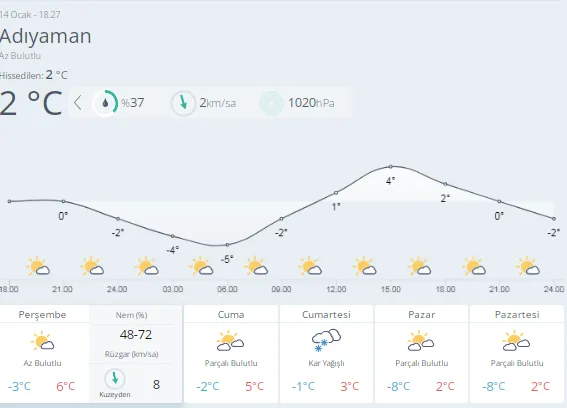 Meteoroloji 13. Bölge Müdürlüğü tarafından yapılan değerlendirmeye göre, 17 Ocak Cumartesi günü Adıyaman genelinde yeniden kar yağışı bekleniyor. Meteoroloji yetkilileri, kar yağışının bir gün süreceğini, yağışın ardından ise soğuk havanın etkisini artıracağını bildirdi.