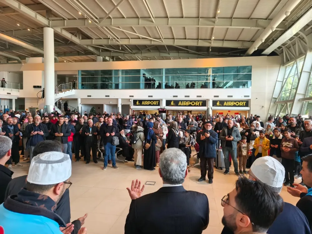 Din görevlileri tarafından okunan ilahiler ve yapılan duaların ardından umre yolcuları, salavat ve tekbirler eşliğinde kutsal topraklara uğurlandı.