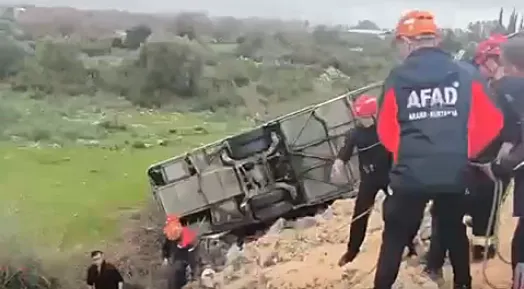 Antalya Kuzey Çevreyolu üzerinde meydana gelen kazada, sürücüsünün direksiyon hâkimiyetini kaybettiği otobüs virajı alamayarak devrildi.