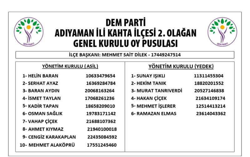Kongrede mevcut Eş Başkanlardan Zelal Özbek yeniden aday olmadı. Yapılan seçim sonucunda mevcut Başkan Mehmet Sait Dilek ve Helin Baran, DEM Parti Kâhta İlçe Örgütü’nün eş başkanları olarak seçildi.