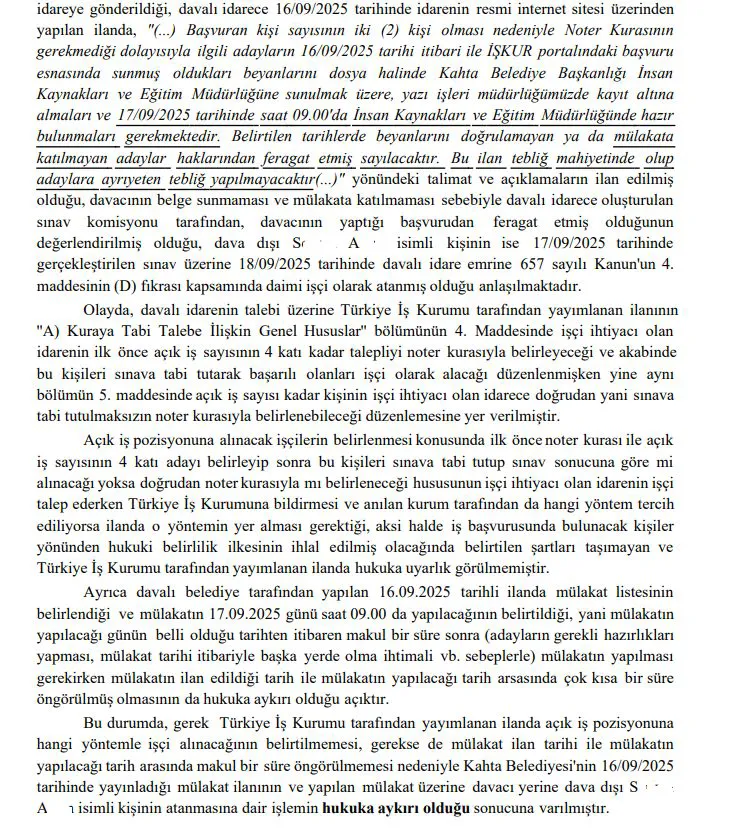 Belediye tarafından yayımlanan resmi yazıda, sınava hak kazanan adayın mülakata çağrıldığı görülüyor. Ancak mahkeme, sürecin ilan ve uygulama yönünden mevzuata uygun yürütülmediği kanaatine varmış durumda.
