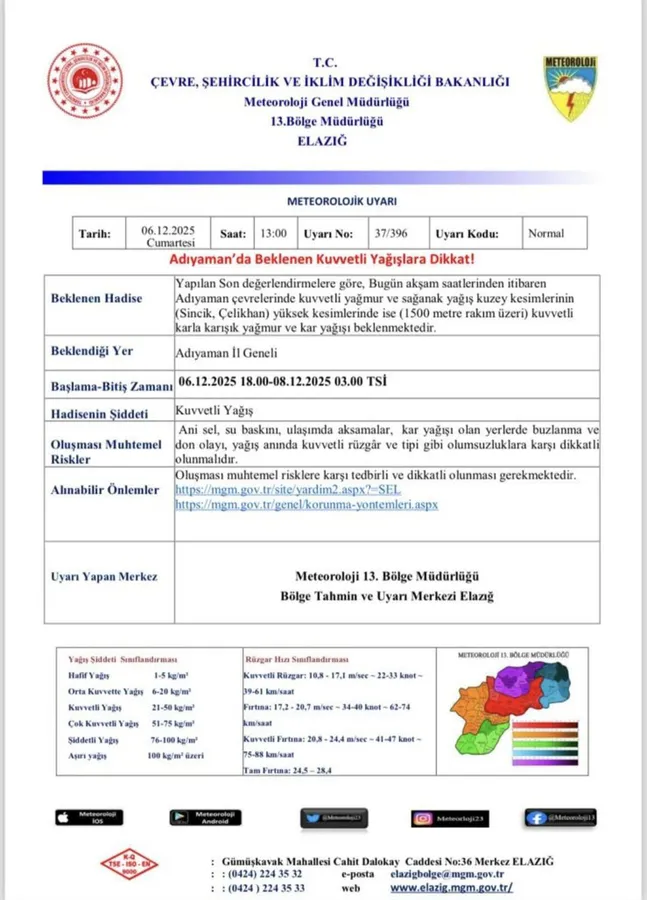 “Bugün akşam saatlerinden itibaren Elazığ, Bingöl, Malatya, Adıyaman ve Tunceli çevrelerinde kuvvetli yağmur; yüksek kesimlerde (1500 metre üzeri) kuvvetli karla karışık yağmur ve kar yağışı beklenmektedir.”