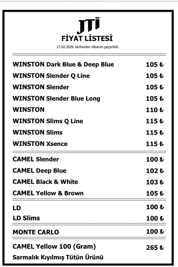 Türkiye Tekel Bayileri Yardımlaşma Derneği Başkanı Erol Dündar, sosyal medya hesabı (X) üzerinden yaptığı açıklamayla sigara fiyatlarındaki yeni artışı kamuoyuna duyurdu. 17 Şubat 2026 itibarıyla geçerli olacak yeni tarifeye göre, JTI bünyesindeki markalarda 10 TL ile 15 TL arasında değişen artışlar görüldü.