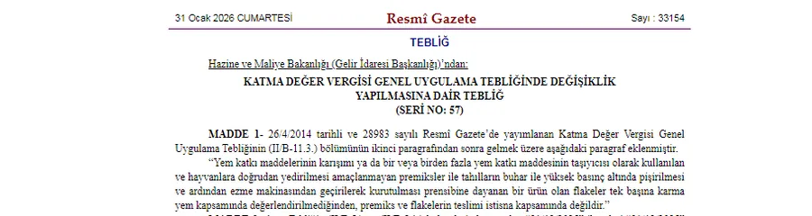 Hazine ve Maliye Bakanlığına bağlı Gelir İdaresi Başkanlığı tarafından hazırlanan ve 31 Ocak 2026 tarihli Resmî Gazete’de yayımlanan tebliğ ile, yem üretiminde kullanılan premiks ve flake ürünlerinde uygulanan KDV istisnası sona erdirildi. Düzenleme kapsamında bu ürünlerden yüzde 20 Katma Değer Vergisi (KDV) alınacak.